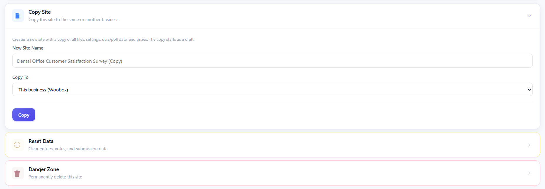 At the bottom of the Settings tab, you can click Copy Site to make an exact copy of the site with a unique URL. The copy can be made to the same business, or any other business in your account. Click Reset Data to clear and permanently delete all entry and vote data, uploads, and traffic stats. And click Danger Zone to permanently delete the site (this cannot be undone).