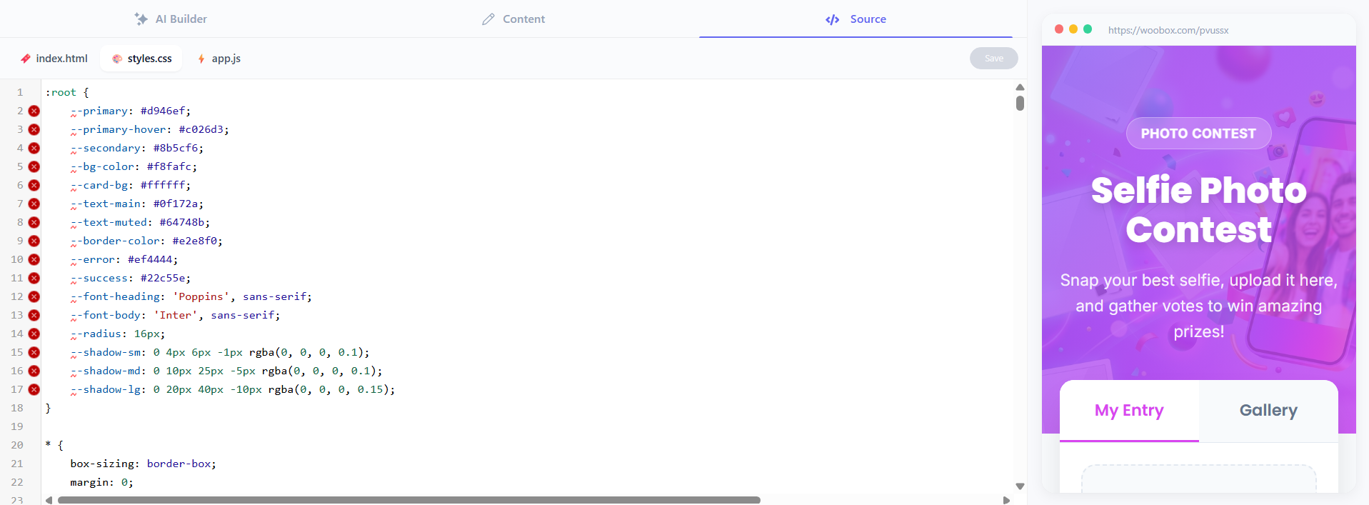 In Sites made with the AI Builder, go to the Builder section and click on the styles.ccs tab.
